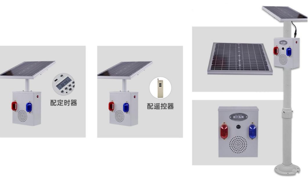 超声波语音设备采用太阳能供电,加装两块 120W 硅晶太阳能板及 100AH 蓄电
